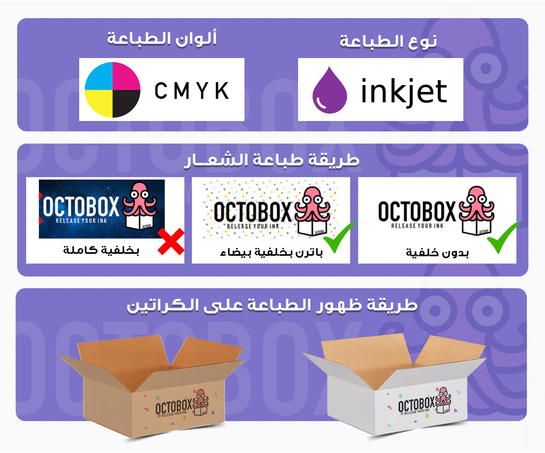 - عدد ألوان مفتوح (قد تظهر ألوان الطباعة عاتمة في الكراتين ذات اللون البني) - لا يتم طباعة اللون الأبيض.