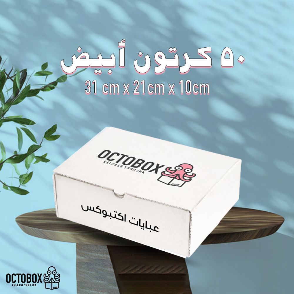 - ٥٠ كرتون أبيض مع طباعة شعار بخلفية بيضاء (شعار مفرّغ) | المقاس: 31cmx21cmx10cm